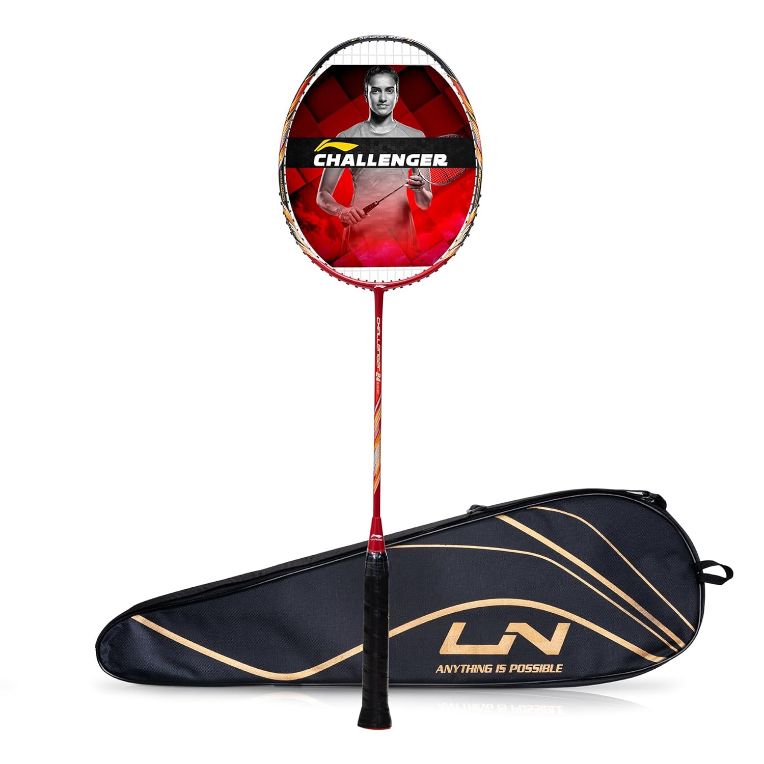 Li-Ning Challenger Boost Carbon Graphite Strung Badminton Racquet, 84 Grams, 30 Lbs String Tension and Free Full Cover (Red/Black)